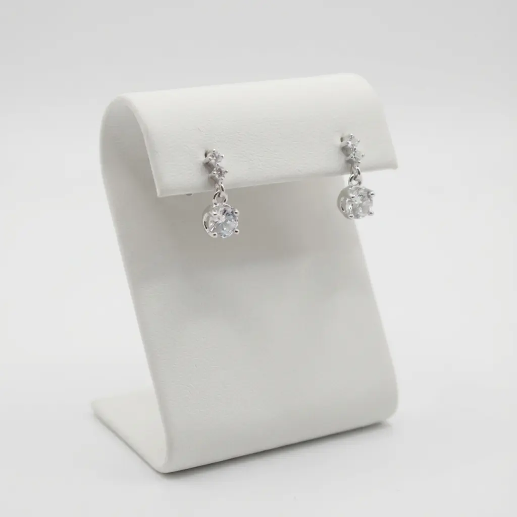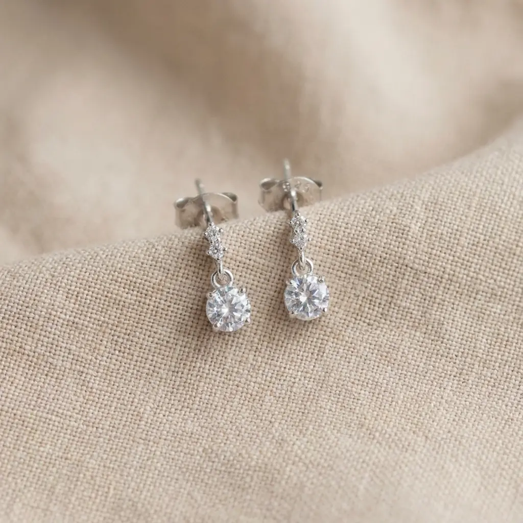 Každá náušnice má oslnivý centrální kámen jemně zavěšený na trojici menších kamenů, které při každém pohybu poskytují jemný, ale podmanivý třpyt.