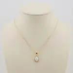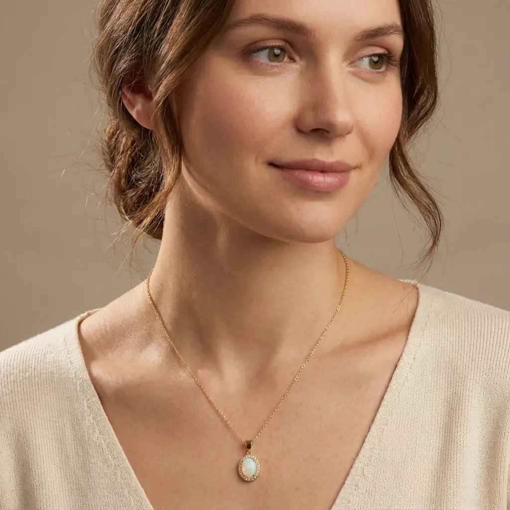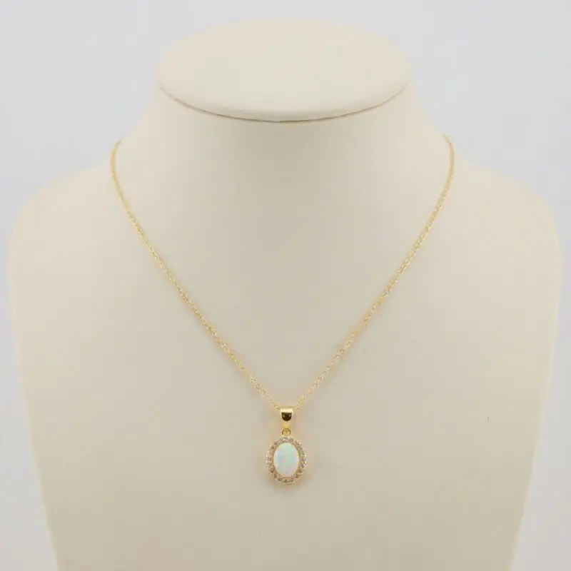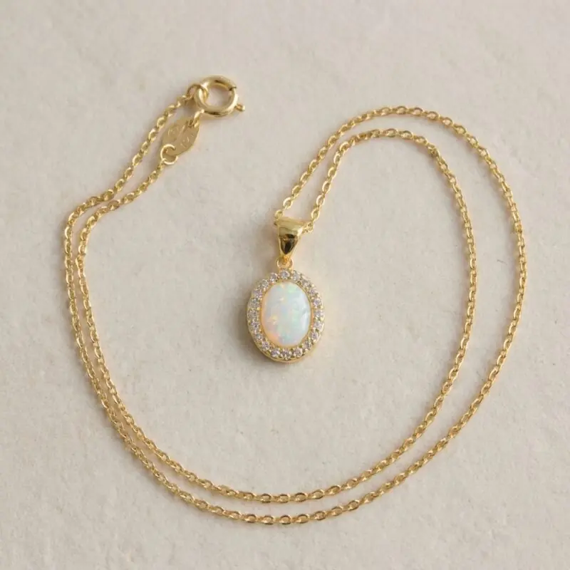 Ogrlica "Aurora", izdelana iz 18-karatnega pozlačenega srebra, izžareva osrednji opalescentni dragulj, ki ga obkrožajo bleščeči poudarki. Zaradi nežne verižice in elegantne oblike obeska je vsestranski dodatek k vsaki obleki, saj vaš videz poudari s prefinjenim sijajem.